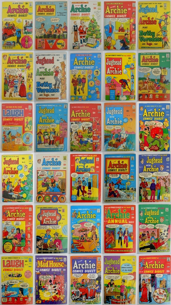 1.) Archie Comics Digest - August, 1973; 2.) Jughead With Archie Digest - March, 1974; 3.) Laugh Comics Digest - August, 1974; 4.) Archie Annual Digest - August, 1975; 5.) Mad House Comics Digest - September, 1975; 6.) Archie, Archie Andrews, Where Are You? Digest - February, 1977; 7.) The Jughead Jones Comics Digest - June, 1977; 8.) Joke Book Comics Digest Annual - October, 1977; 9.) Little Archie Comics Digest Annual - October, 1977; 10.) Archie's Super-Hero Comics Digest - January, 1979.