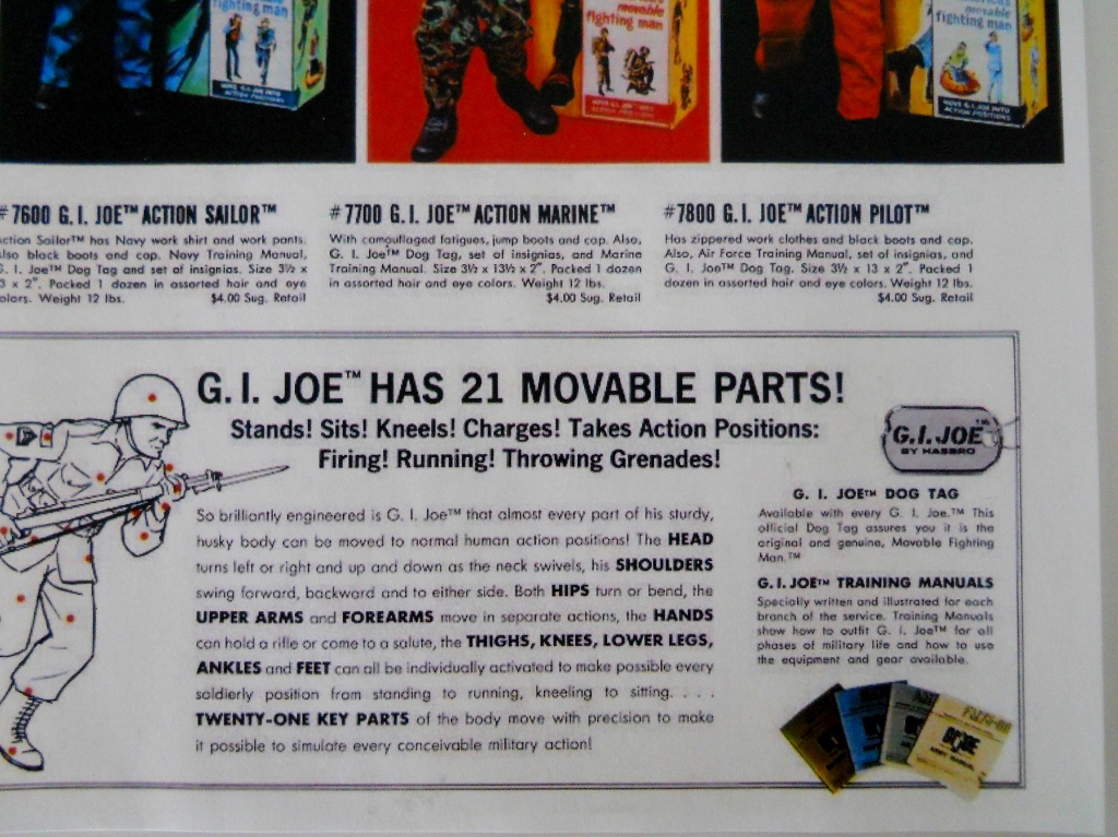 In the 1964 GI Joe Salesman's Catalog, one of the ads contained therein states that "GI Joe has 21 Movable Parts." But, does he? Pictured below is the 1964 ad, with the photo of a GI Joe action figure located directly beneath it. Can you name the "21 Movable Parts?"