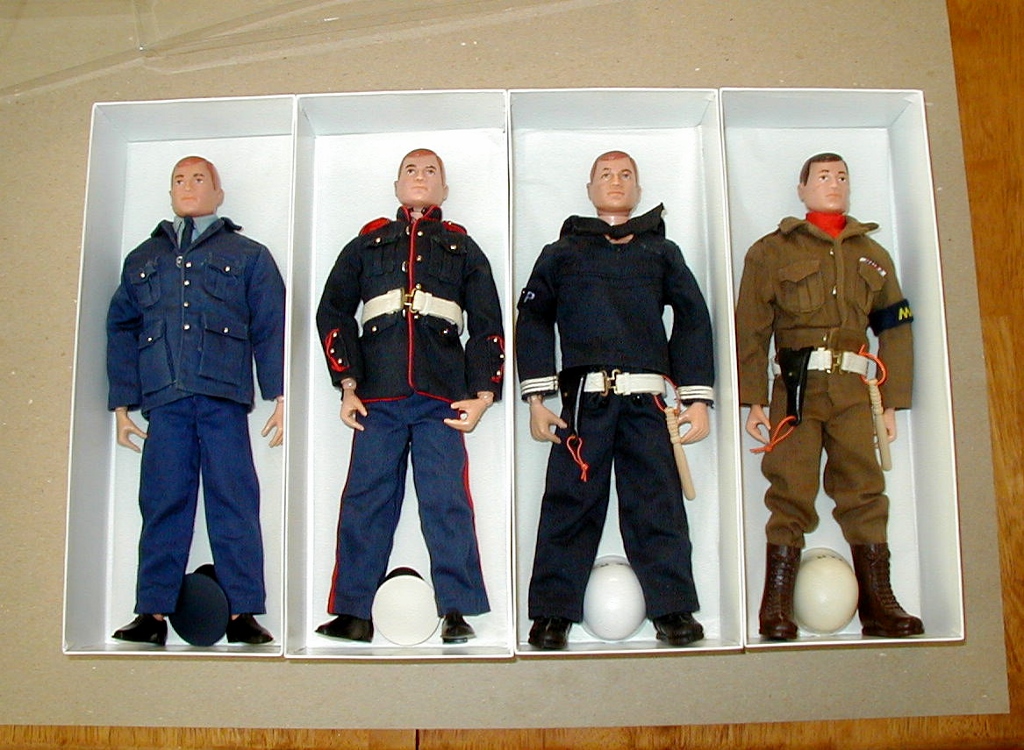 The other eight uniforms shown are: 1.) Combat Soldier in his combat field jacket, 2.) Navy Attack Sailor in his orange life jacket and blue attack helmet, 3.) Air Force Scramble Pilot, 4.) Navy Scuba Diver, 5.) Army Alpine Snow Troops, 6.) Deep Sea Diver, 7.) Communications Marine in his camouflage poncho, 8.) Marine Medic in medic helmet and arm bands.