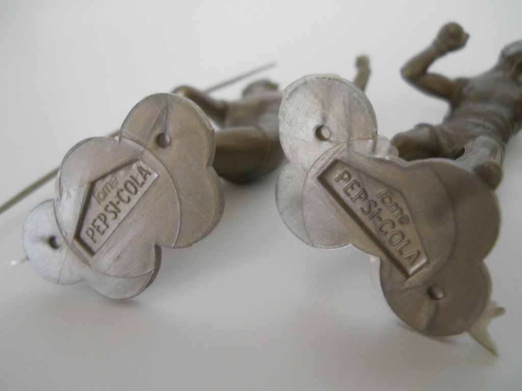 We have seen other identical vintage plastic sports figures to these, molded in different colors (usually in gray), and given this, we are uncertain as to whether or not these 1967 figures were the first to be produced. Be that as it may, we are confident that only the ones molded in this quasi-gold color, with the above printing under their base, are authentic "Pepsi-Cola" premium Pan-Am Games figures.