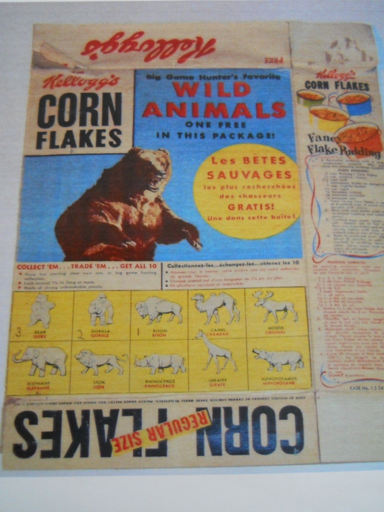 The photo below shows the back of a Canadian (bilingual) Kellogg's Corn Flakes cereal box. There were 10 different figures that could be collected. The photo beneath it shows all ten different figures.