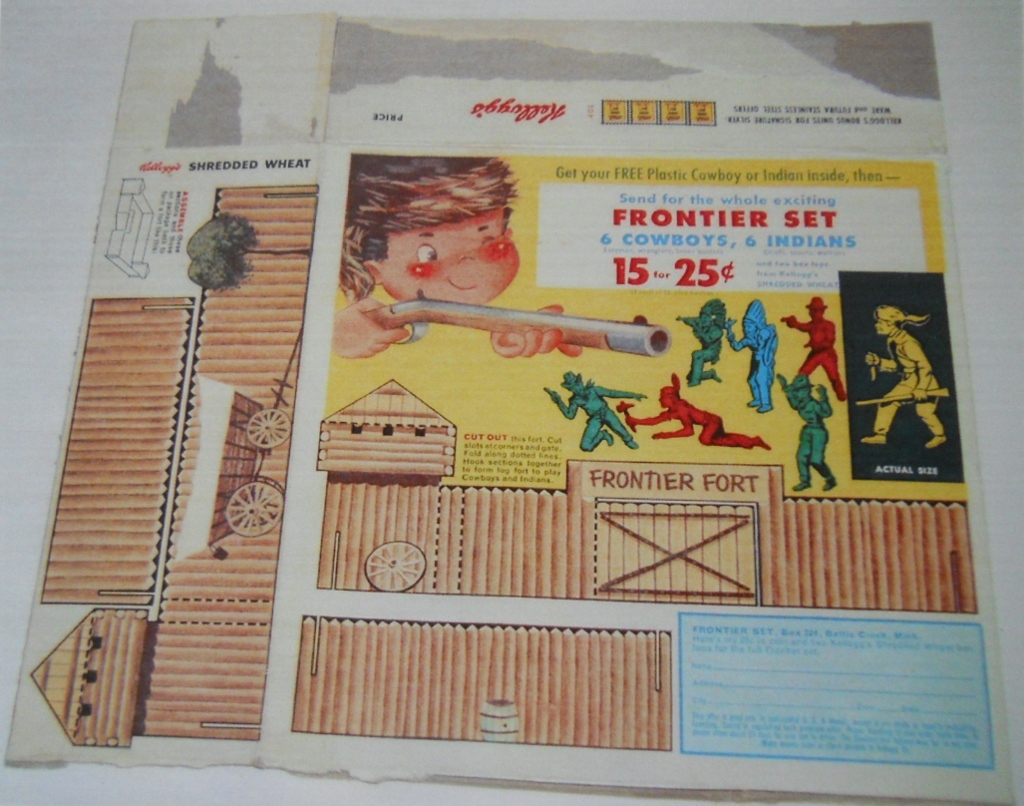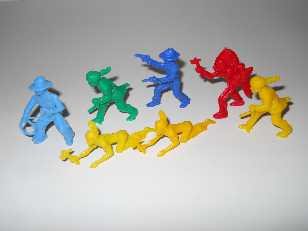 Yet another series of plastic cereal premium figures that was available on both sides of the border was the colorful Kellogg's "Cowboys and Indians" toy line. The photo below depicts seven of these figures in five different poses. The back cover of a vintage cereal box is shown next to them.