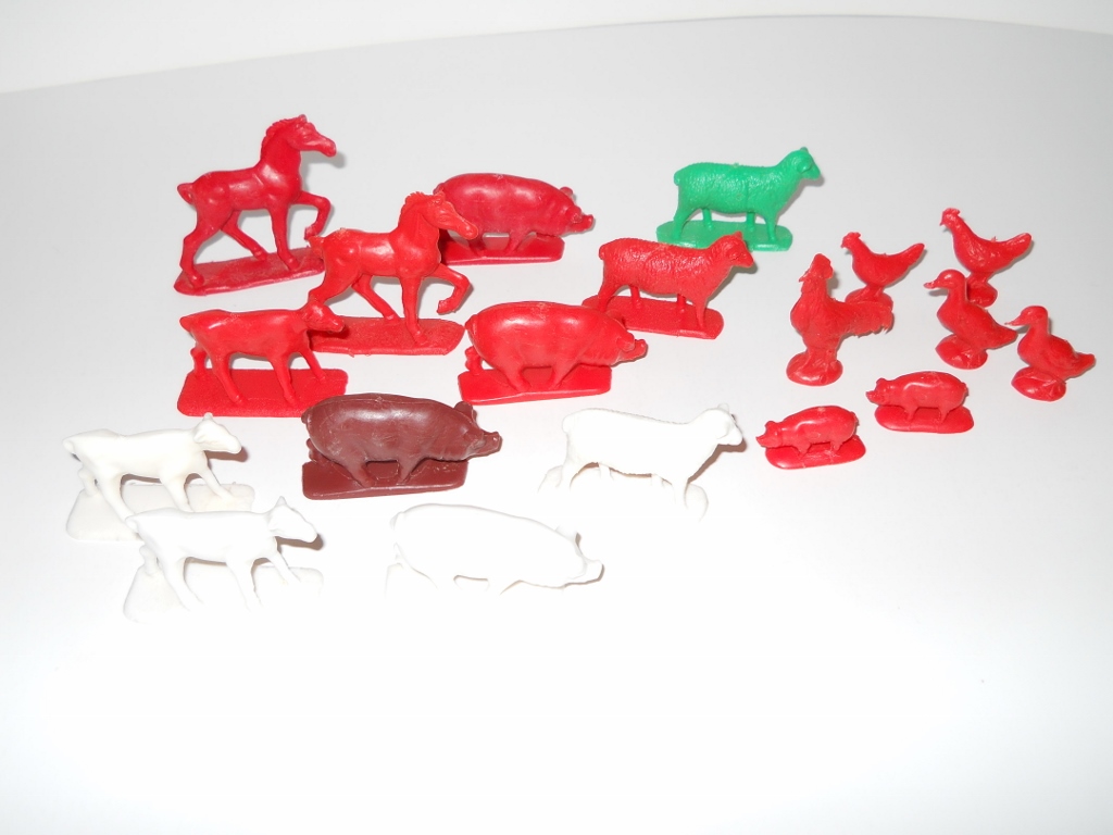 The plastic farm animals pictured above were identical to "Reliable Toys" brand farm animals that were sold at the time in retail stores. They were molded after the "Auburn Toys" farm animals of the same design, but both the cereal premium animals and the Reliable animals were made from poly-plastic while the earlier Auburn animals were made from a soft and bendable vinyl plastic.
