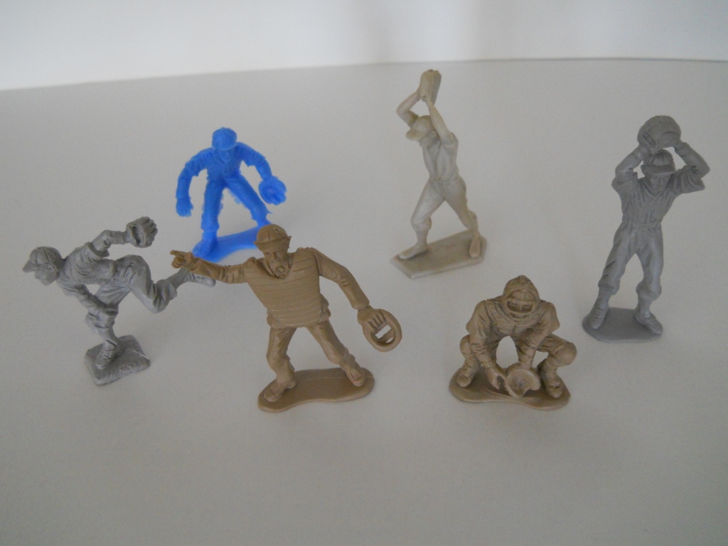 During the early 1960's, Canadian Kellogg's Frosted Flakes cereal boxes contained a series of "baseball player" plastic toy premiums. They were made from "Lido" baseball player molds and, in terms of size, quality and design, they were very similar. The ones that I recall having were all molded in "gray" plastic, but they may have been available in tan color, too; of that, I'm uncertain. (Note: The light gray pitcher in the back row is not a "Lido" figure, but a "Marx" sports character and the bright blue figure is a much later recast and not a cereal premium figure.)