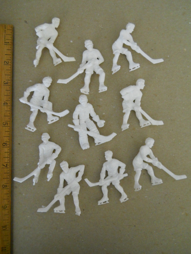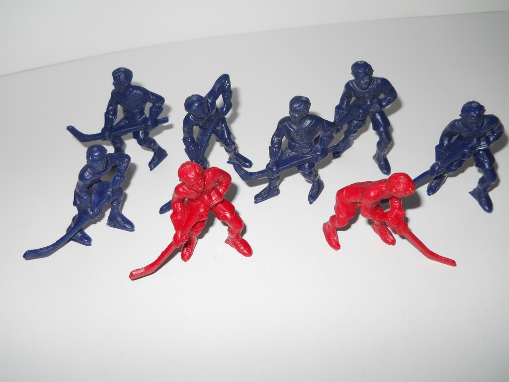 These plastic hockey players were manufactured from "Lido" toy molds and distributed as premiums in the late 1950's and early 1960's in Canadian cereal boxes. These cereal figures came in three basic colors: a dark cherry red, very dark blue and bright white. (N.B. These figures were also manufactured for other forms of distribution as well and the tip-off that they may not be 1960's Canadian cereal premium figures is if the blue and red colors are lighter in tone, and when compared to the Canadian cereal premium figures, are slightly smaller in scale.)