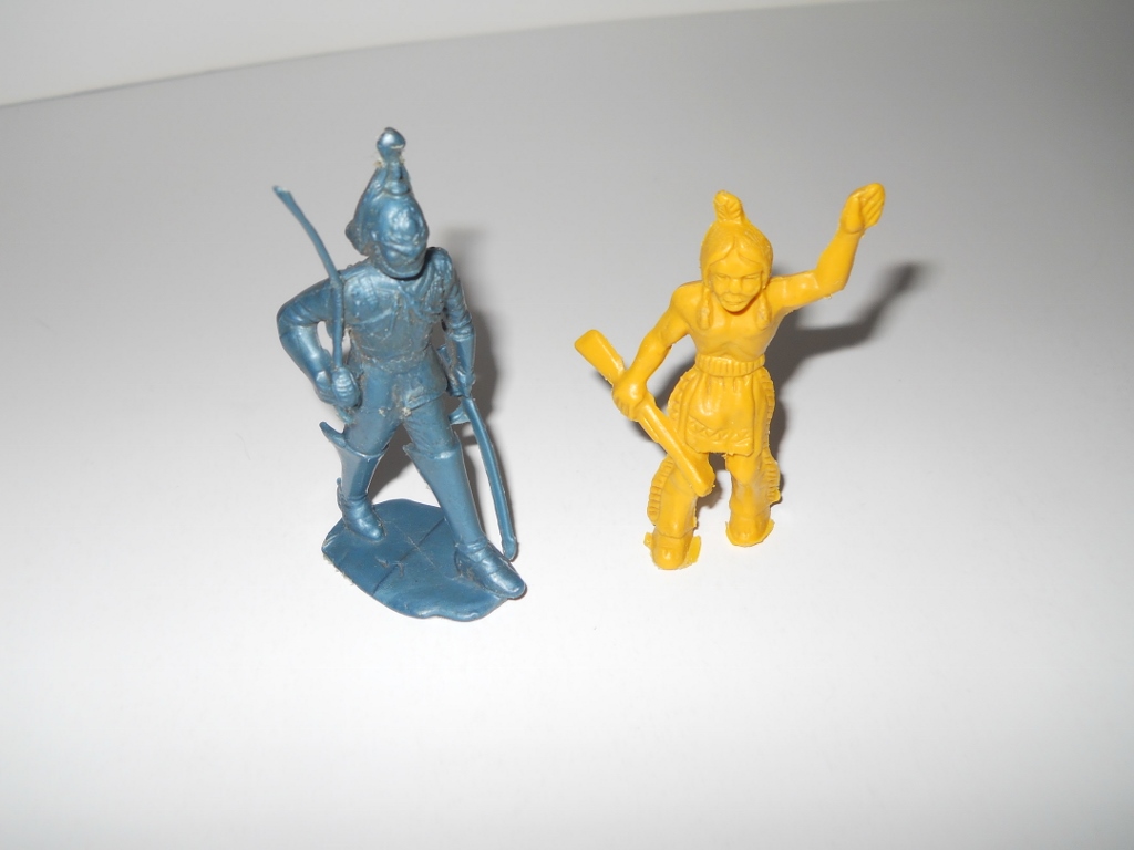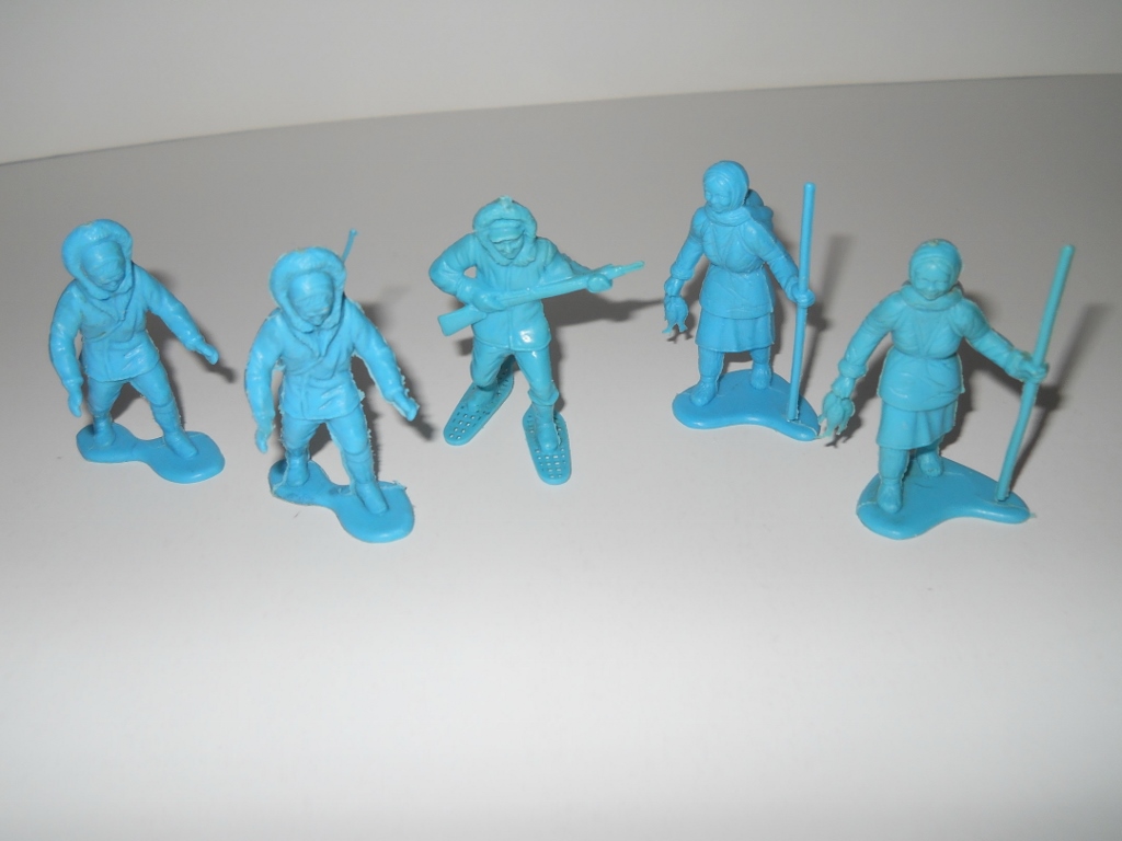 Shortly following the release of the "Marx" Robin Hood figures in Canadian cereal boxes, a series of "Marx" Eskimo figures was also offered. The photo below shows a small sampling of these Eskimo cereal premiums. Like the Robin Hood figures, there was a color variation between the Canadian figures and the original Marx playset figures. U.S. made figures are of a much lighter blue tone than the Canadian premium figures, which are brighter blue.