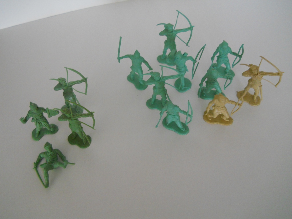 In Canadian Kellogg's cereal boxes during the 1960s, some of the plastic toy premium figures given away were made from "Marx Toys" molds. Shown below are a number of vintage "Robin Hood" cereal premium figures. In the next photo beneath it, we have contrasted these Canadian figures against a batch of "Made in U.S.A." Marx Robin Hood figures that came from an original 1950's/60's Marx Playset. Notice the difference in the color of the original "blue-green" U.S. figures versus the Canadian ones. Also, note that none of the Canadian cereal premiums came in a "tan" color, all of the Canadian cereal figures were green.
