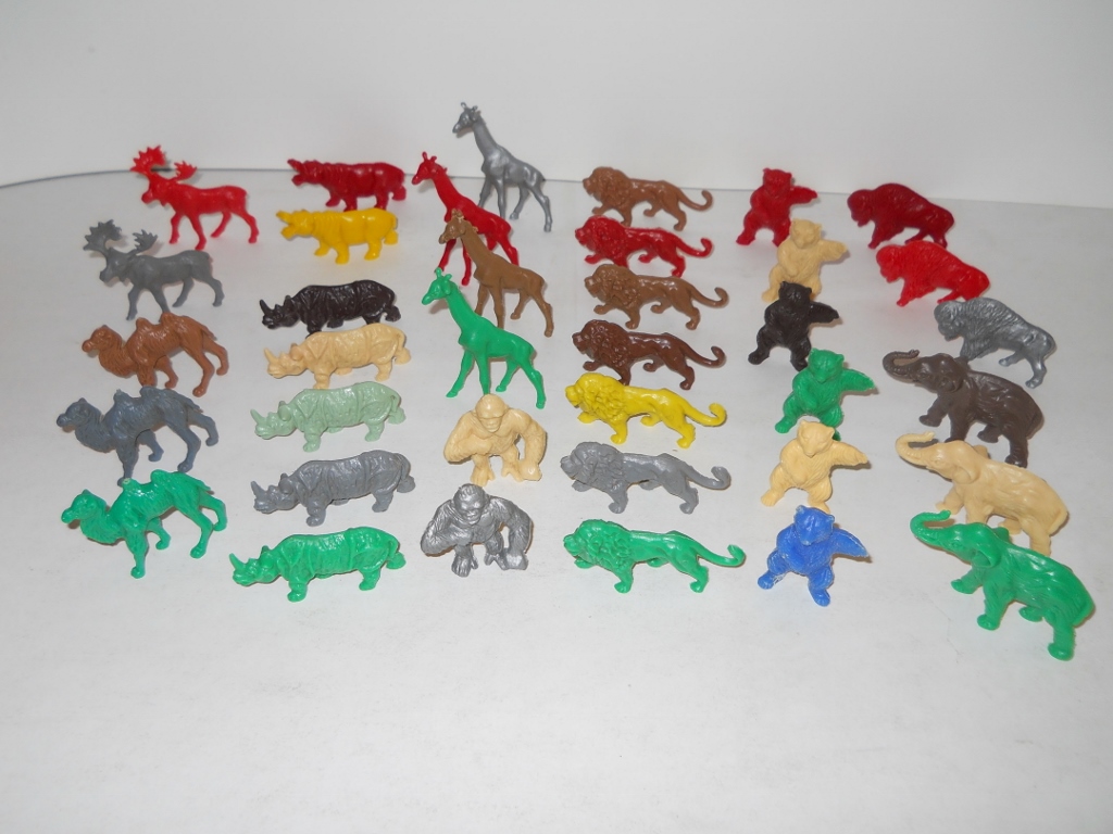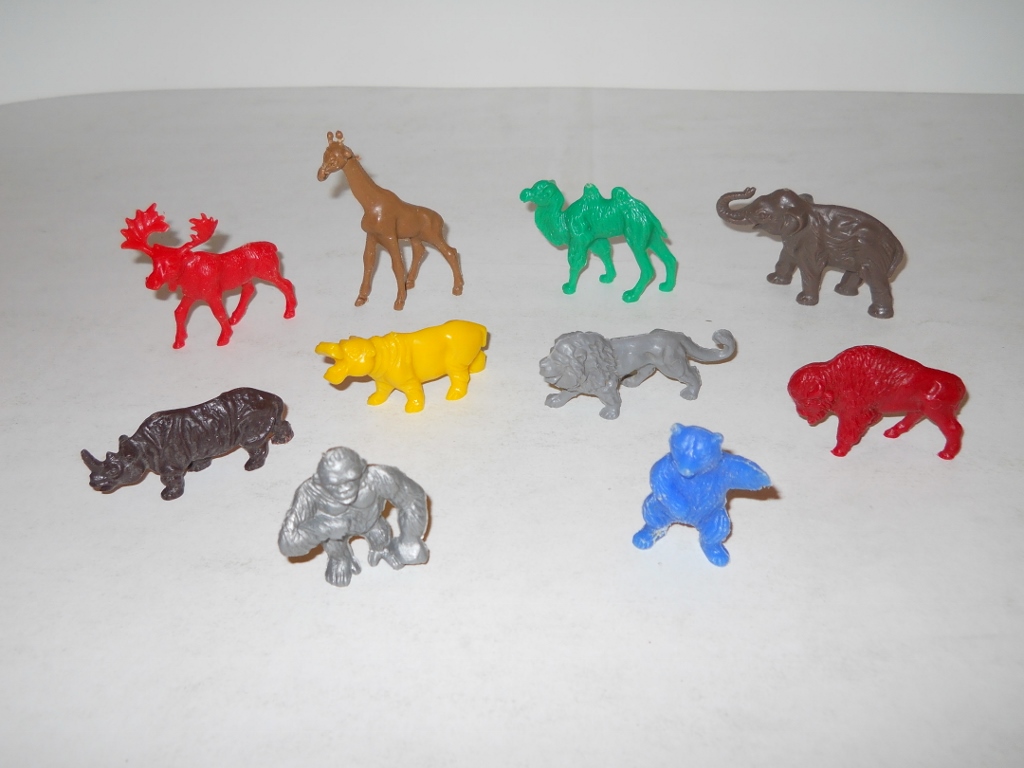 One of the more memorable cereal premium offerings, found in boxes of Kellogg's Corn Flakes, was the "Big Game Hunter's Wild Animals" series. The photo below shows my collection of these Lido-brand plastic animal figures in a wide range of colors. We have been told that the figures that could be found inside Canadian Kellogg's cereal boxes only came in four colors; either brown, tan, cream or soft green. The other various colors shown below were likely made by Lido (the manufacturer) for sale in retail stores, but the other colors were not originally found in Kellogg's boxes in the 1960's.
